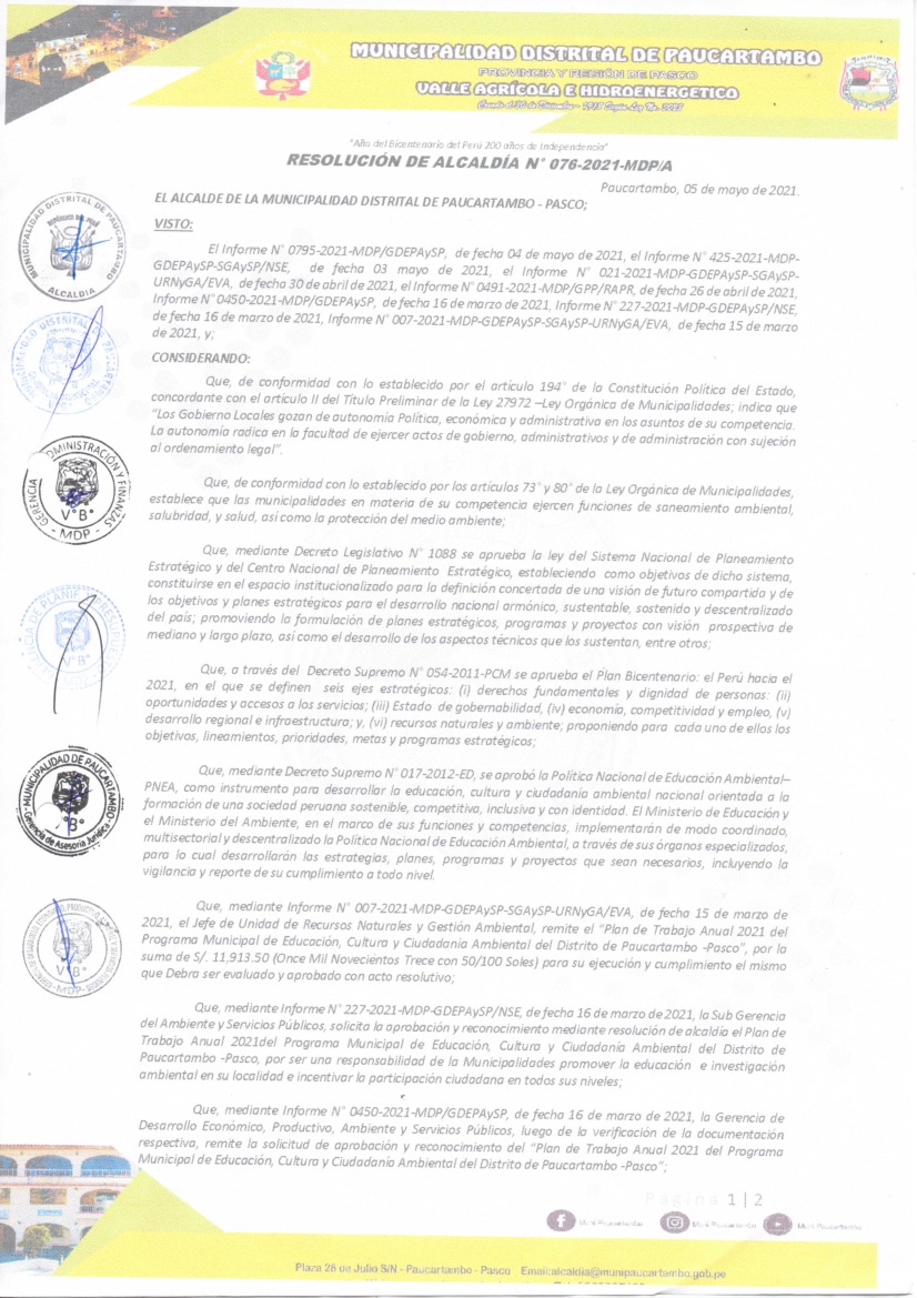 La presente Resolución aprueba el Plan de Trabajo 2021 del Programa Municipal de Educación, Cultura y Ciudadanía Ambiental de la Municipalidad Distrital de Paucartambo, con la finalidad de definir las actividades de educación, cultura y ciudadanía ambiental que se desarrollarán en la localidad durante el presente año.