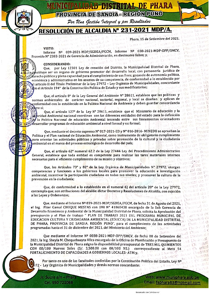 La presente Resolución aprueba el Plan de Trabajo 2021 del Programa Municipal de Educación, Cultura y Ciudadanía Ambiental de la Municipalidad Distrital de Phara, con la finalidad de definir las actividades de educación, cultura y ciudadanía ambiental que se desarrollarán en la localidad durante el presente año.