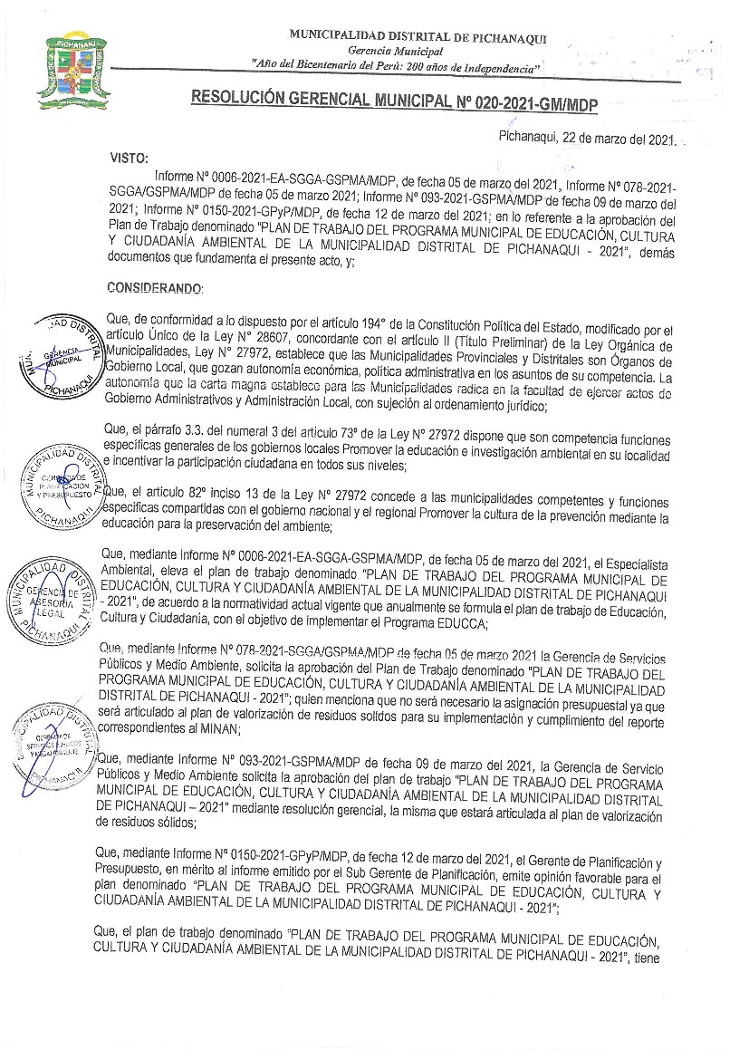 La presente Resolución aprueba el Plan de Trabajo 2021 del Programa Municipal de Educación, Cultura y Ciudadanía Ambiental de la Municipalidad Distrital de Pichanaqui, con la finalidad de definir las actividades de educación, cultura y ciudadanía ambiental que se desarrollarán en la localidad durante el presente año.