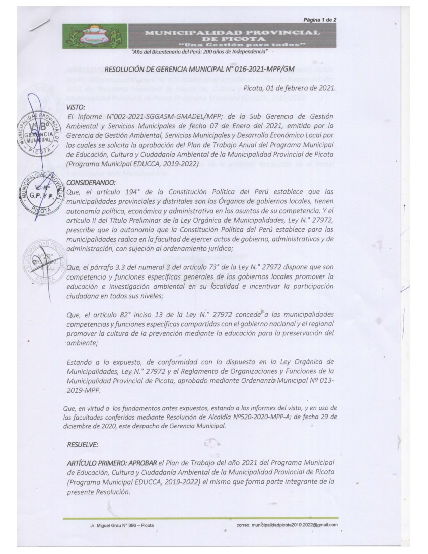 La presente Resolución aprueba el Plan de Trabajo 2021 del Programa Municipal de Educación, Cultura y Ciudadanía Ambiental de la Municipalidad Provincia de Picota, con la finalidad de definir las actividades de educación, cultura y ciudadanía ambiental que se desarrollarán en la localidad durante el presente año
