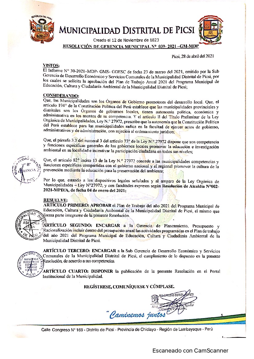 La presente Resolución aprueba el Plan de Trabajo 2021 del Programa Municipal de Educación, Cultura y Ciudadanía Ambiental de la Municipalidad Distrital de Picsi, con la finalidad de definir las actividades de educación, cultura y ciudadanía ambiental que se desarrollarán en la localidad durante el presente año.