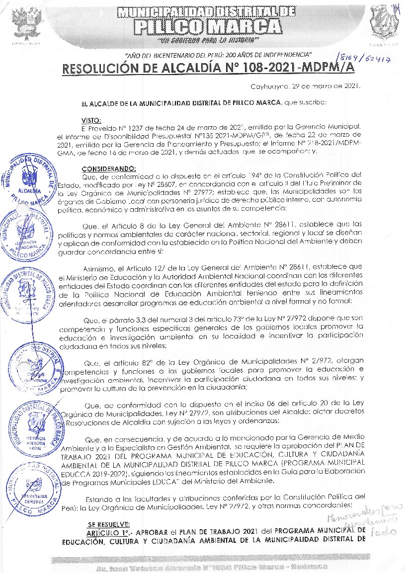 La presente Resolución aprueba el Plan de Trabajo 2021 del Programa Municipal de Educación, Cultura y Ciudadanía Ambiental de la Municipalidad Distrital de Pillco Marca, con la finalidad de definir las actividades de educación, cultura y ciudadanía ambiental que se desarrollarán en la localidad durante el presente año.