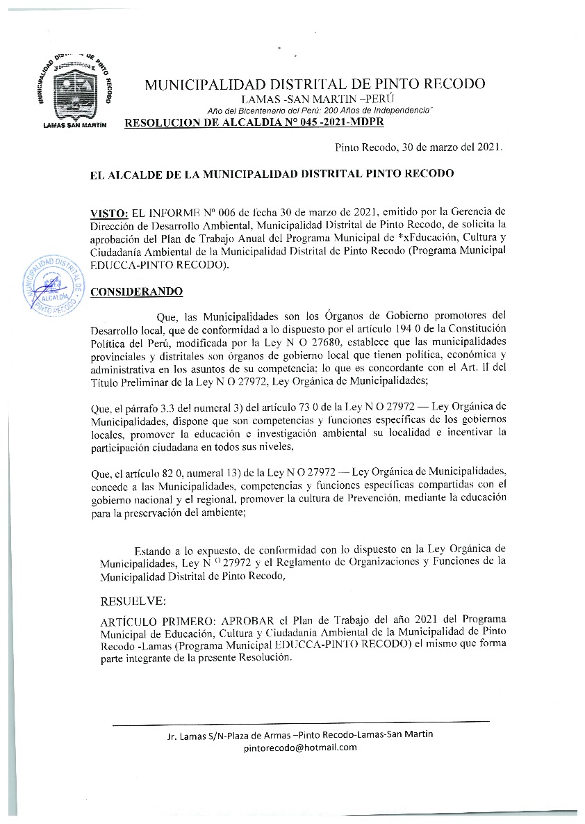 La presente Resolución aprueba el Plan de Trabajo 2021 del Programa Municipal de Educación, Cultura y Ciudadanía Ambiental de la Municipalidad Distrital de Pinto Recodo, con la finalidad de definir las actividades de educación, cultura y ciudadanía ambiental que se desarrollarán en la localidad durante el presente año.