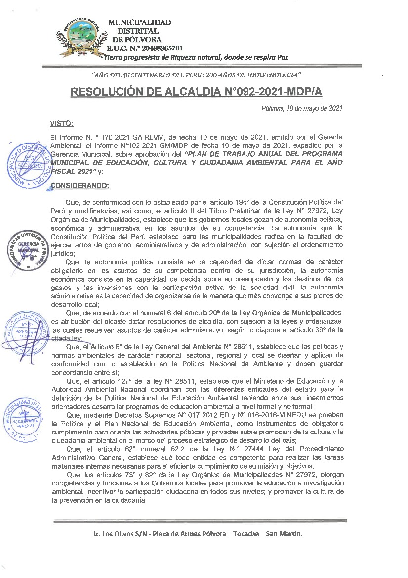La presente Resolución aprueba el Plan de Trabajo 2021 del Programa Municipal de Educación, Cultura y Ciudadanía Ambiental de la Municipalidad Distrital de Pólvora, con la finalidad de definir las actividades de educación, cultura y ciudadanía ambiental que se desarrollarán en la localidad durante el presente año.