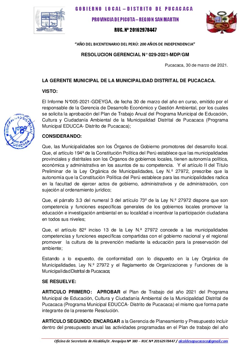 La presente Resolución aprueba el Plan de Trabajo 2021 del Programa Municipal de Educación, Cultura y Ciudadanía Ambiental de la Municipalidad Distrital de Pucacaca, con la finalidad de definir las actividades de educación, cultura y ciudadanía ambiental que se desarrollarán en la localidad durante el presente año.
