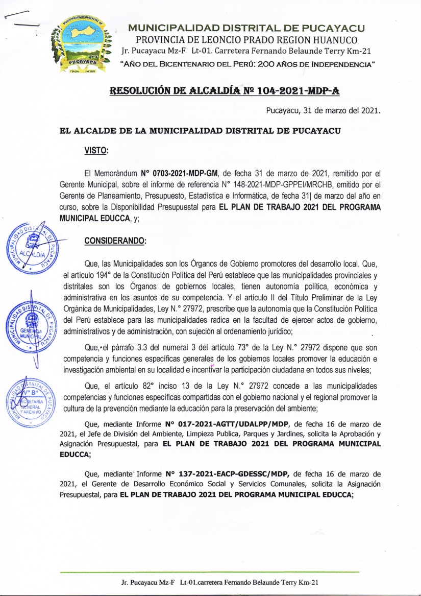 La presente Resolución aprueba el Plan de Trabajo 2021 del Programa Municipal de Educación, Cultura y Ciudadanía Ambiental de la Municipalidad Distrital de Pucayacu, con la finalidad de definir las actividades de educación, cultura y ciudadanía ambiental que se desarrollarán en la localidad durante el presente año.
