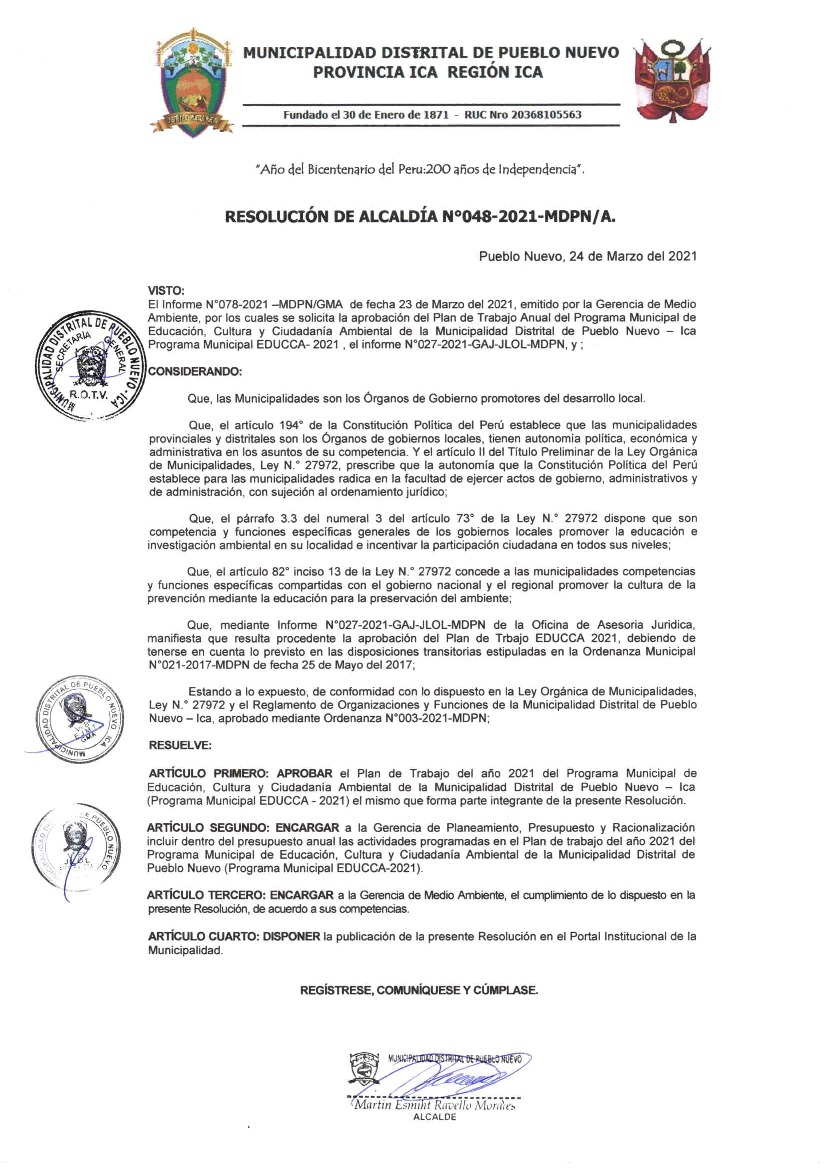 La presente Resolución aprueba el Plan de Trabajo 2021 del Programa Municipal de Educación, Cultura y Ciudadanía Ambiental de la Municipalidad Distrital de Pueblo Nuevo-Ica, con la finalidad de definir las actividades de educación, cultura y ciudadanía ambiental que se desarrollarán en la localidad durante el presente año.