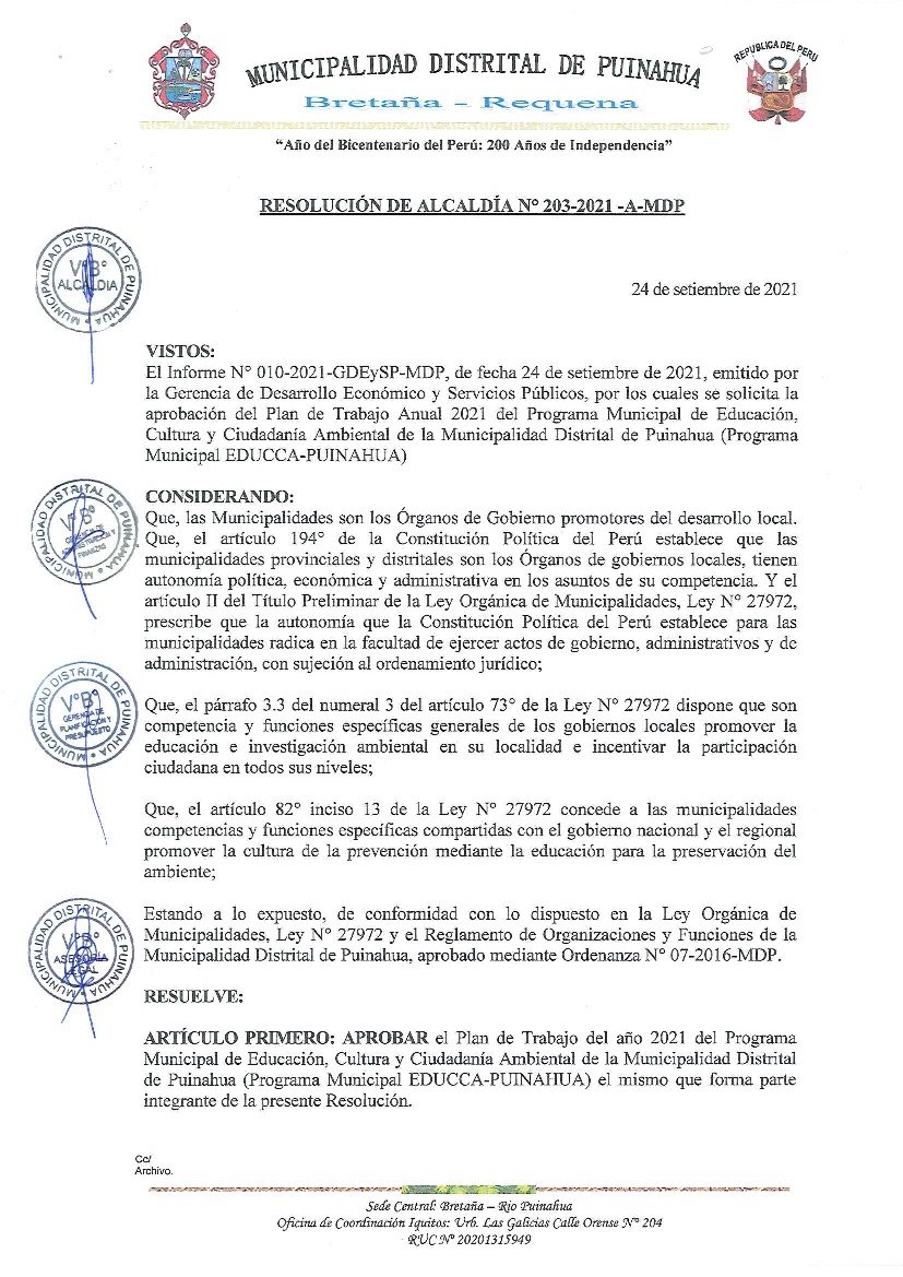 La presente Resolución aprueba el Plan de Trabajo 2021 del Programa Municipal de Educación, Cultura y Ciudadanía Ambiental de la Municipalidad Distrital de Puinahua, con la finalidad de definir las actividades de educación, cultura y ciudadanía ambiental que se desarrollarán en la localidad durante el presente año.