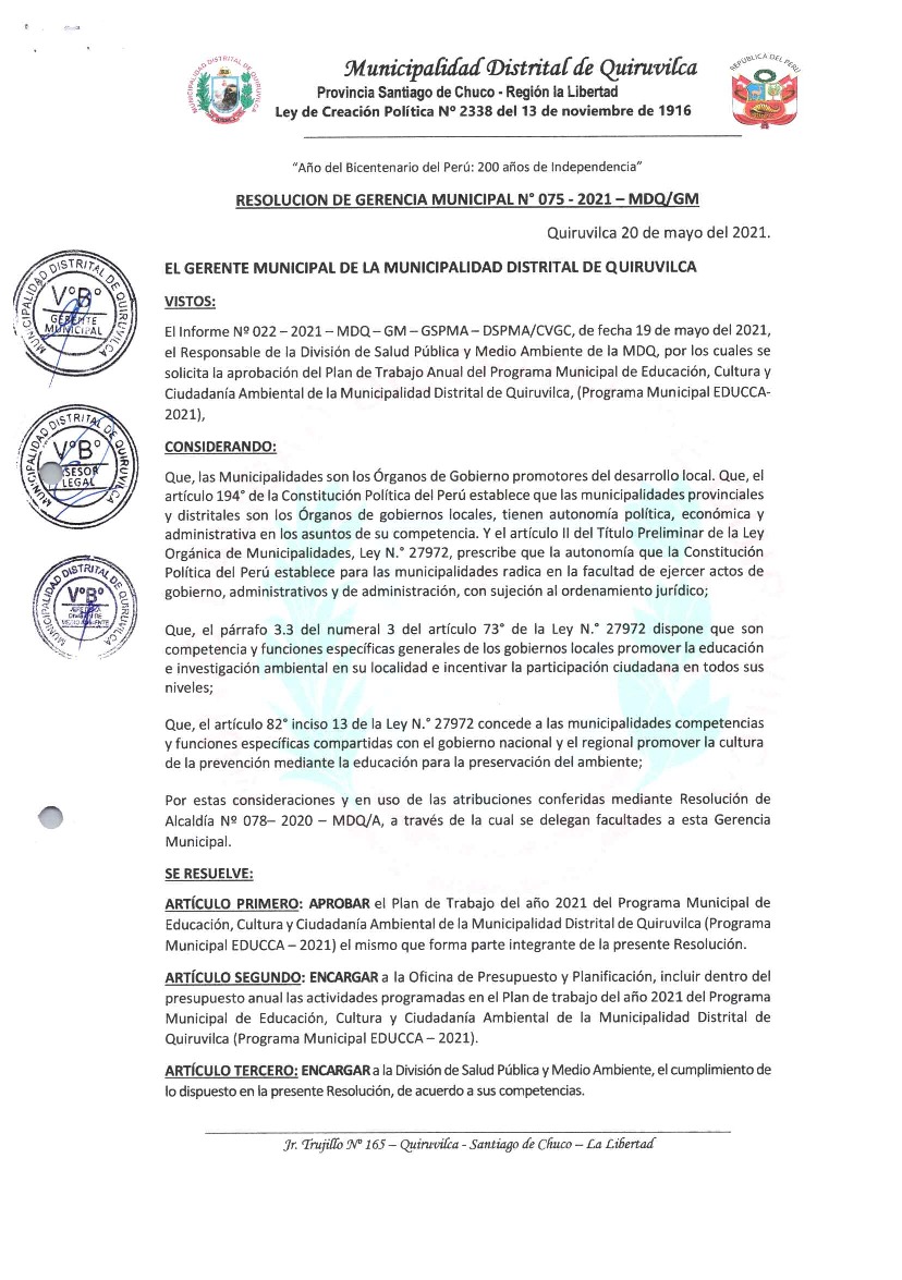 La presente Resolución aprueba el Plan de Trabajo 2021 del Programa Municipal de Educación, Cultura y Ciudadanía Ambiental de la Municipalidad Distrital de Quiruvilca, con la finalidad de definir las actividades de educación, cultura y ciudadanía ambiental que se desarrollarán en la localidad durante el presente año.