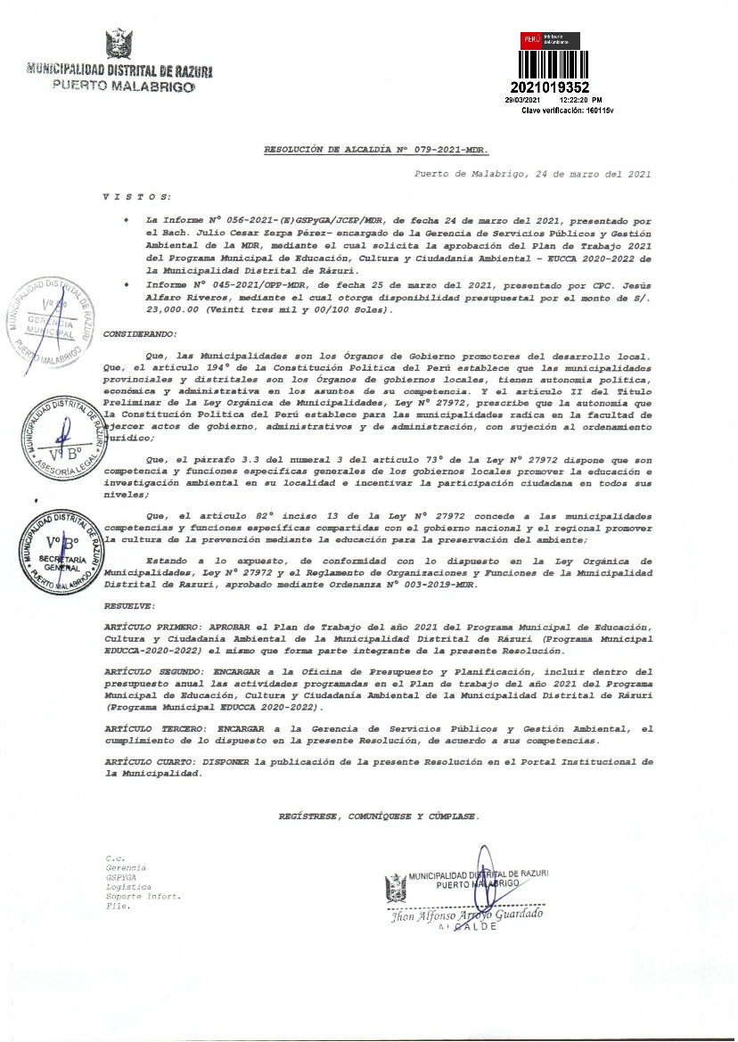La presente Resolución aprueba el Plan de Trabajo 2021 del Programa Municipal de Educación, Cultura y Ciudadanía Ambiental de la Municipalidad Distrital de Razuri, con la finalidad de definir las actividades de educación, cultura y ciudadanía ambiental que se desarrollarán en la localidad durante el presente año.