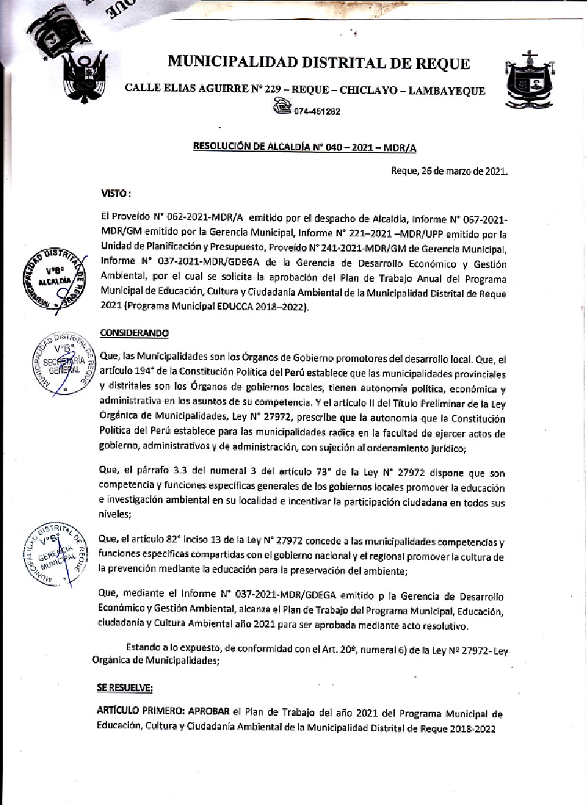 La presente Resolución aprueba el Plan de Trabajo 2021 del Programa Municipal de Educación, Cultura y Ciudadanía Ambiental de la Municipalidad Distrital de Reque, con la finalidad de definir las actividades de educación, cultura y ciudadanía ambiental que se desarrollarán en la localidad durante el presente año.