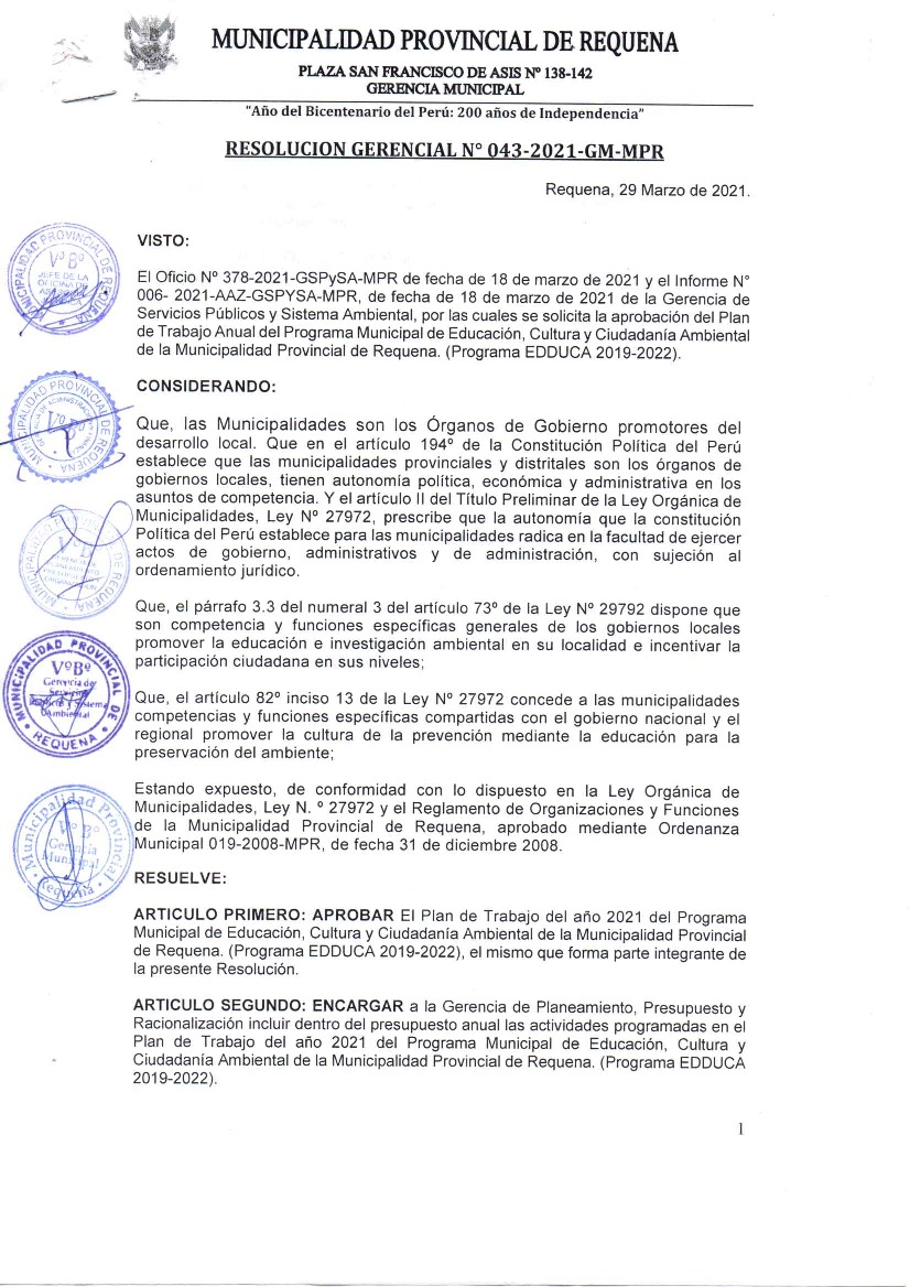 La presente Resolución aprueba el Plan de Trabajo 2021 del Programa Municipal de Educación, Cultura y Ciudadanía Ambiental de la Municipalidad Provincia de Requena, con la finalidad de definir las actividades de educación, cultura y ciudadanía ambiental que se desarrollarán en la localidad durante el presente año.