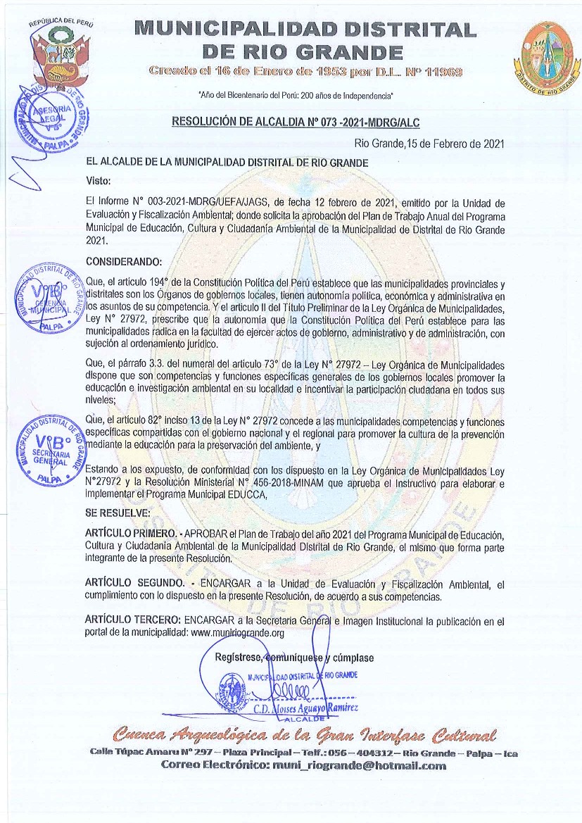 La presente Resolución aprueba el Plan de Trabajo 2021 del Programa Municipal de Educación, Cultura y Ciudadanía Ambiental de la Municipalidad Distrital de Río Grande con la finalidad de definir las actividades de educación, cultura y ciudadanía ambiental que se desarrollarán en la localidad durante el presente año.
