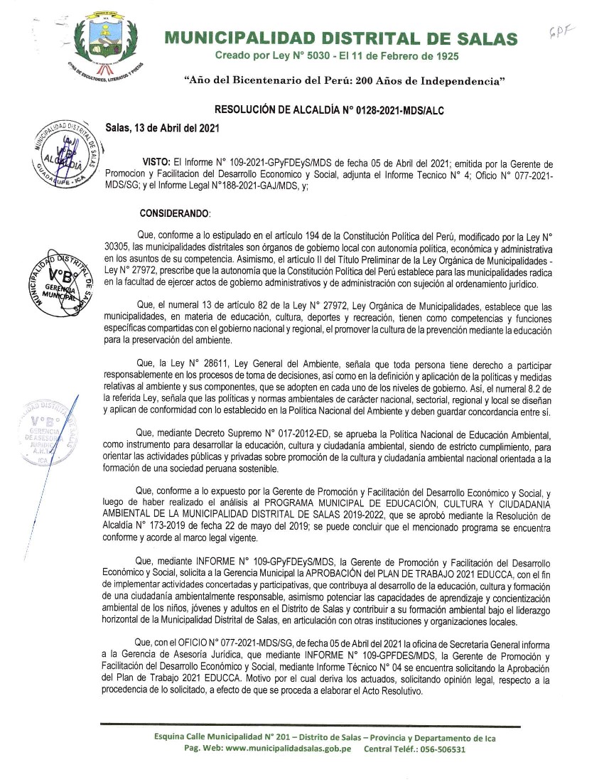 La presente Resolución aprueba el Plan de Trabajo 2021 del Programa Municipal de Educación, Cultura y Ciudadanía Ambiental de la Municipalidad Distrital de Salas, con la finalidad de definir las actividades de educación, cultura y ciudadanía ambiental que se desarrollarán en la localidad durante el presente año.