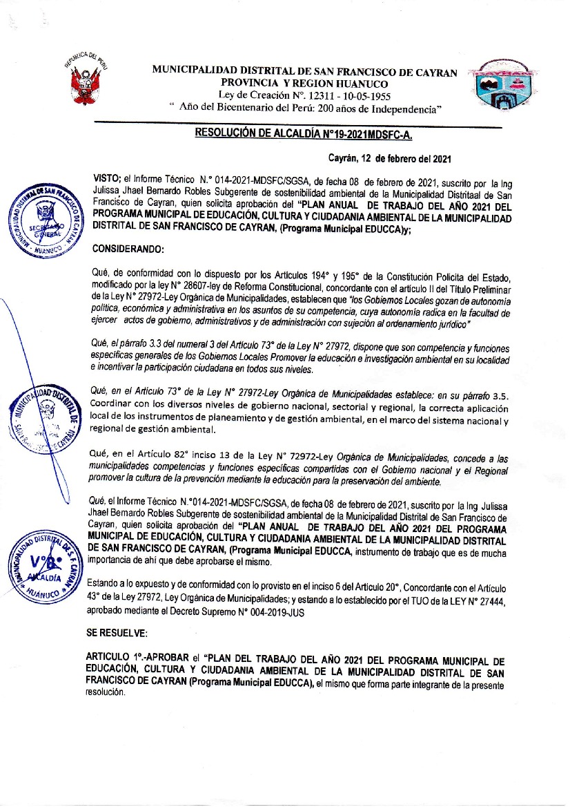 La presente Resolución aprueba el Plan de Trabajo 2021 del Programa Municipal de Educación, Cultura y Ciudadanía Ambiental de la Municipalidad Distrital de San Francisco de Cayran, con la finalidad de definir las actividades de educación, cultura y ciudadanía ambiental que se desarrollarán en la localidad durante el presente año.