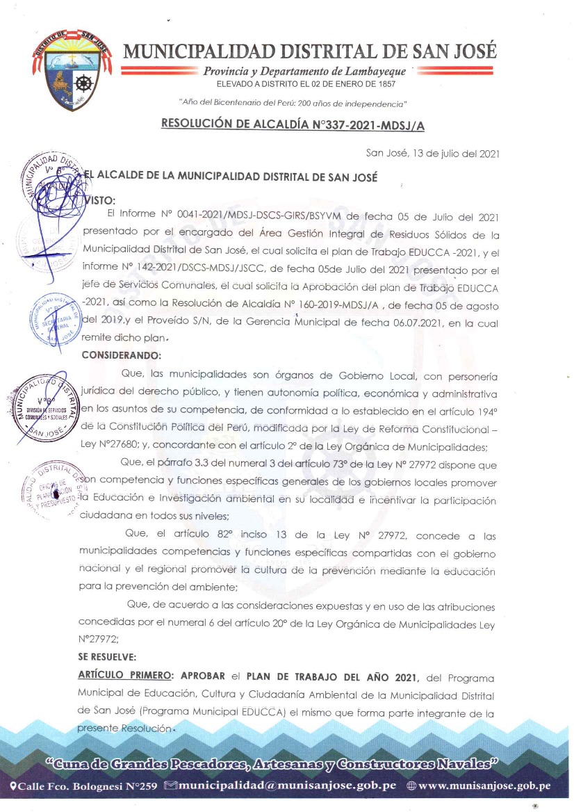 La presente Resolución aprueba el Plan de Trabajo 2021 del Programa Municipal de Educación, Cultura y Ciudadanía Ambiental de la Municipalidad Distrital de San José, con la finalidad de definir las actividades de educación, cultura y ciudadanía ambiental que se desarrollarán en la localidad durante el presente año.