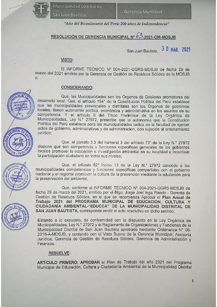 La presente Resolución aprueba el Plan de Trabajo 2021 del Programa Municipal de Educación, Cultura y Ciudadanía Ambiental de la Municipalidad Distrital de San Juan Bautista, con la finalidad de definir las actividades de educación, cultura y ciudadanía ambiental que se desarrollarán en la localidad durante el presente año