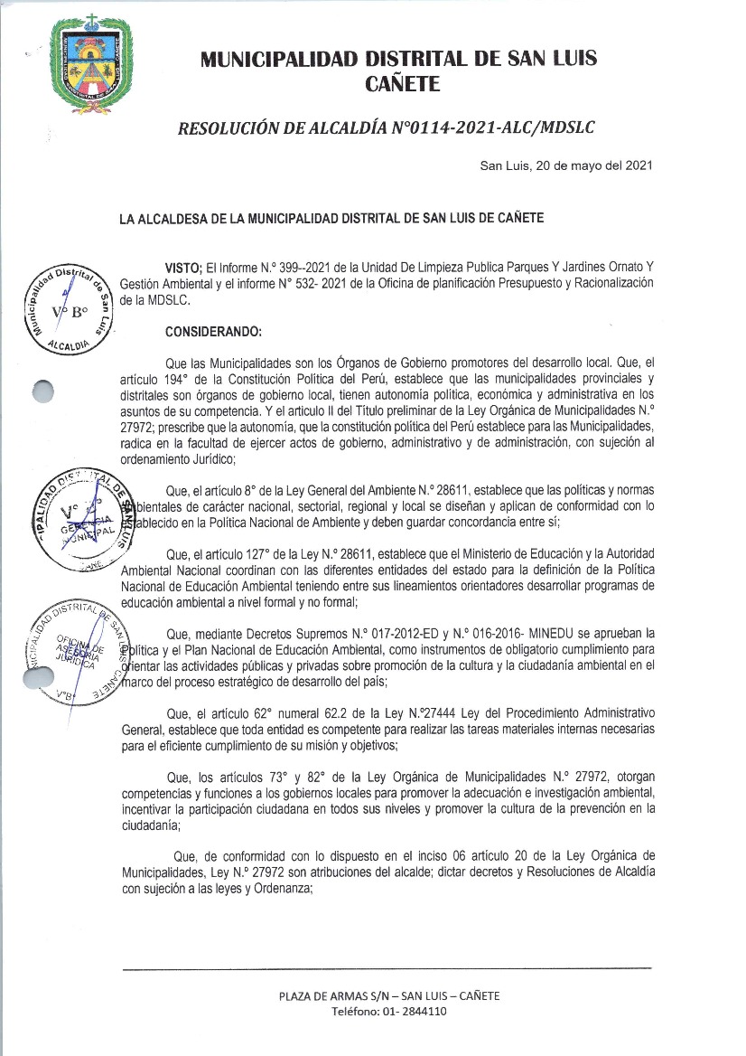 La presente Resolución aprueba el Plan de Trabajo 2021 del Programa Municipal de Educación, Cultura y Ciudadanía Ambiental de la Municipalidad Distrital de San Luis- Cañete, con la finalidad de definir las actividades de educación, cultura y ciudadanía ambiental que se desarrollarán en la localidad durante el presente año.