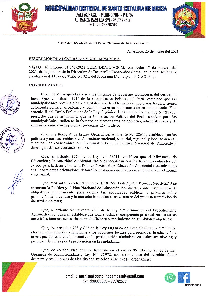 La presente Resolución aprueba el Plan de Trabajo 2021 del Programa Municipal de Educación, Cultura y Ciudadanía Ambiental de la Municipalidad Distrital de Santa Catalina de Mossa, con la finalidad de definir las actividades de educación, cultura y ciudadanía ambiental que se desarrollarán en la localidad durante el presente año.