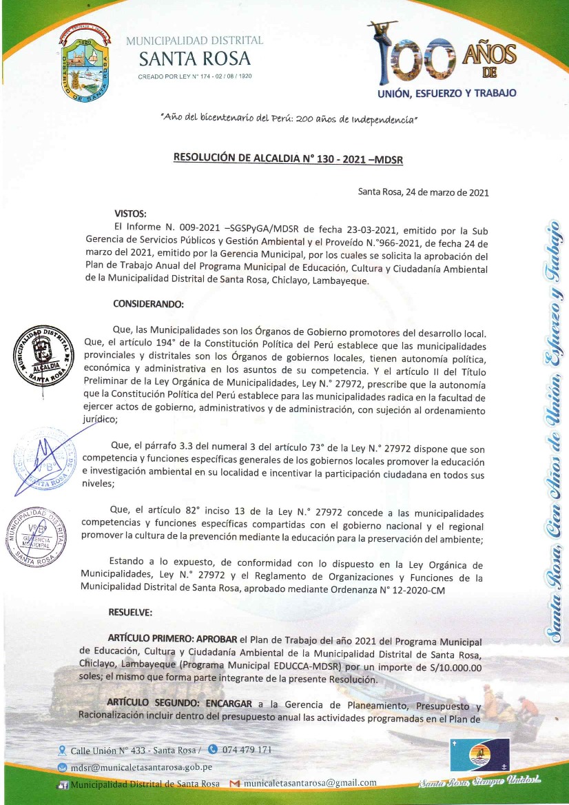 La presente Resolución aprueba el Plan de Trabajo 2021 del Programa Municipal de Educación, Cultura y Ciudadanía Ambiental de la Municipalidad Distrital de Santa Rosa, con la finalidad de definir las actividades de educación, cultura y ciudadanía ambiental que se desarrollarán en la localidad durante el presente año.