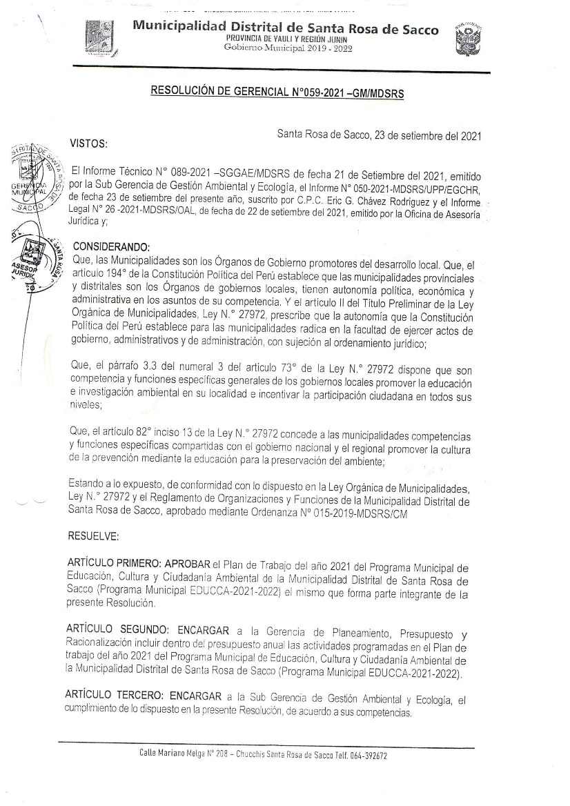 La presente Resolución aprueba el Plan de Trabajo 2021 del Programa Municipal de Educación, Cultura y Ciudadanía Ambiental de la Municipalidad de Santa Rosa de Sacco, con la finalidad de definir las actividades de educación, cultura y ciudadanía ambiental que se desarrollarán en la localidad durante el presente año.