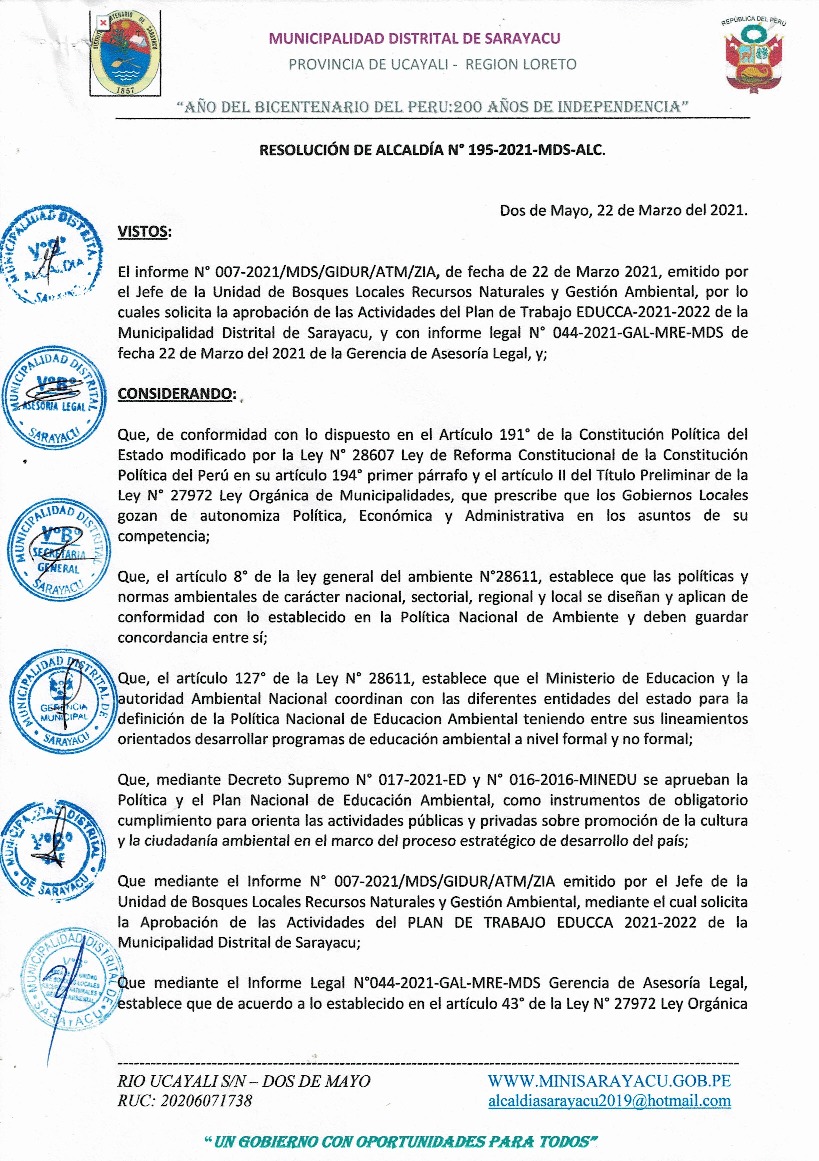 La presente Resolución aprueba el Plan de Trabajo 2021 del Programa Municipal de Educación, Cultura y Ciudadanía Ambiental de la Municipalidad Distrital de Sarayacu, con la finalidad de definir las actividades de educación, cultura y ciudadanía ambiental que se desarrollarán en la localidad durante el presente año.