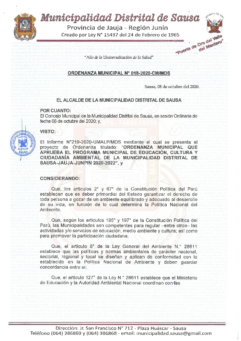 La presente Resolución aprueba el Plan de Trabajo 2021 del Programa Municipal de Educación, Cultura y Ciudadanía Ambiental de la Municipalidad Distrital de Sausa, con la finalidad de definir las actividades de educación, cultura y ciudadanía ambiental que se desarrollarán en la localidad durante el presente año.