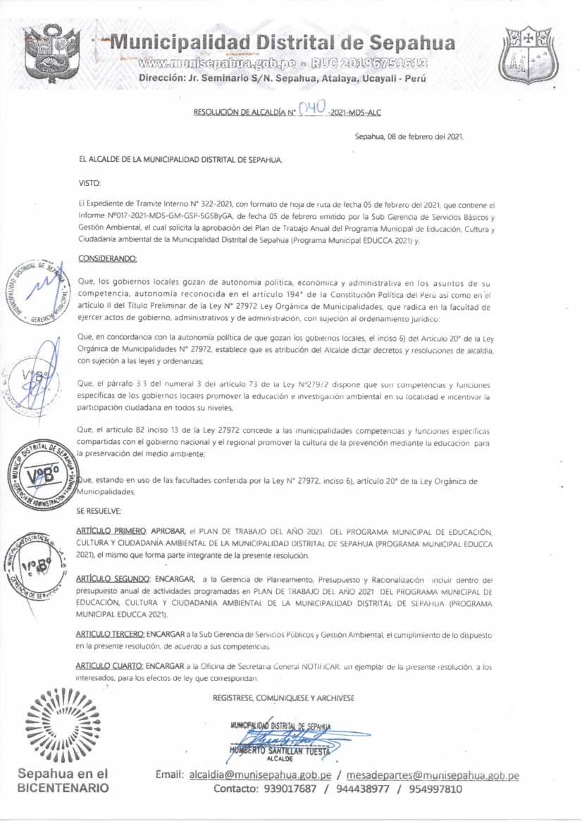 La presente Resolución aprueba el Plan de Trabajo 2021 del Programa Municipal de Educación, Cultura y Ciudadanía Ambiental de la Municipalidad Distrital de Sepahua, con la finalidad de definir las actividades de educación, cultura y ciudadanía ambiental que se desarrollarán en la localidad durante el presente año.