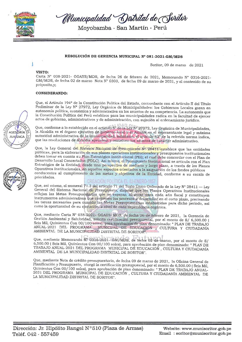 La presente Resolución aprueba el Plan de Trabajo 2021 del Programa Municipal de Educación, Cultura y Ciudadanía Ambiental de la Municipalidad Distrital de Soritor, con la finalidad de definir las actividades de educación, cultura y ciudadanía ambiental que se desarrollarán en la localidad durante el presente año.