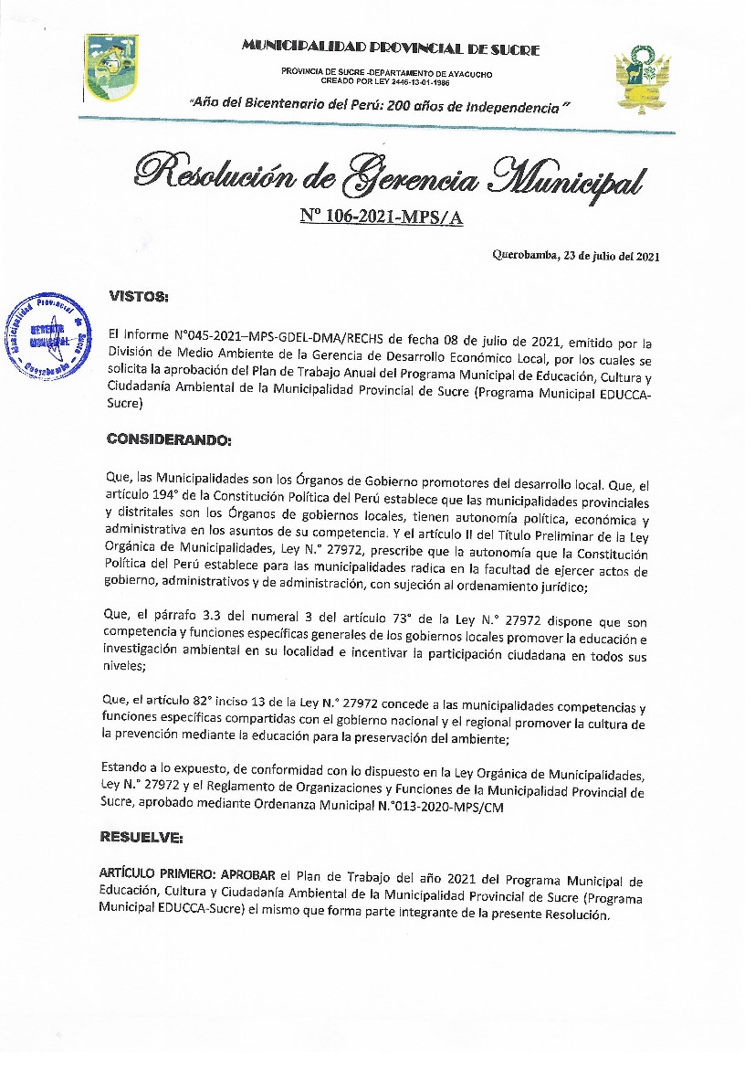 La presente Resolución aprueba el Plan de Trabajo 2021 del Programa Municipal de Educación, Cultura y Ciudadanía Ambiental de la Municipalidad Provincial de Sucre, con la finalidad de definir las actividades de educación, cultura y ciudadanía ambiental que se desarrollarán en la localidad durante el presente año.