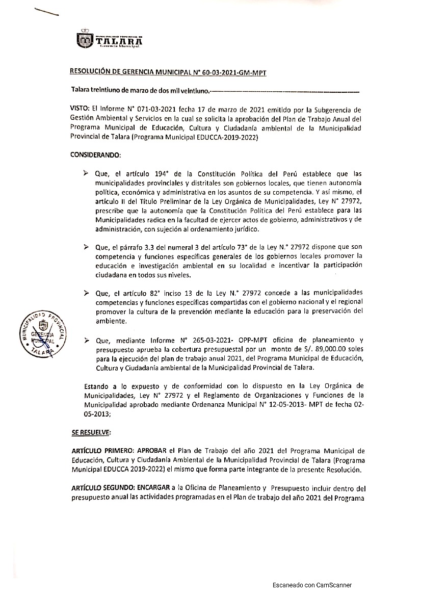La presente Resolución aprueba el Plan de Trabajo 2021 del Programa Municipal de Educación, Cultura y Ciudadanía Ambiental de la Municipalidad Provincia de Talara, con la finalidad de definir las actividades de educación, cultura y ciudadanía ambiental que se desarrollarán en la localidad durante el presente año.