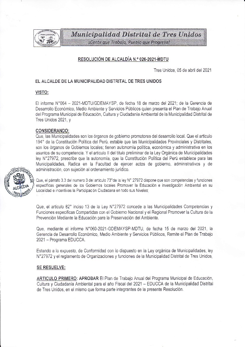 La presente Resolución aprueba el Plan de Trabajo 2021 del Programa Municipal de Educación, Cultura y Ciudadanía Ambiental de la Municipalidad Distrital de Tres Unidos, con la finalidad de definir las actividades de educación, cultura y ciudadanía ambiental que se desarrollarán en la localidad durante el presente año.
