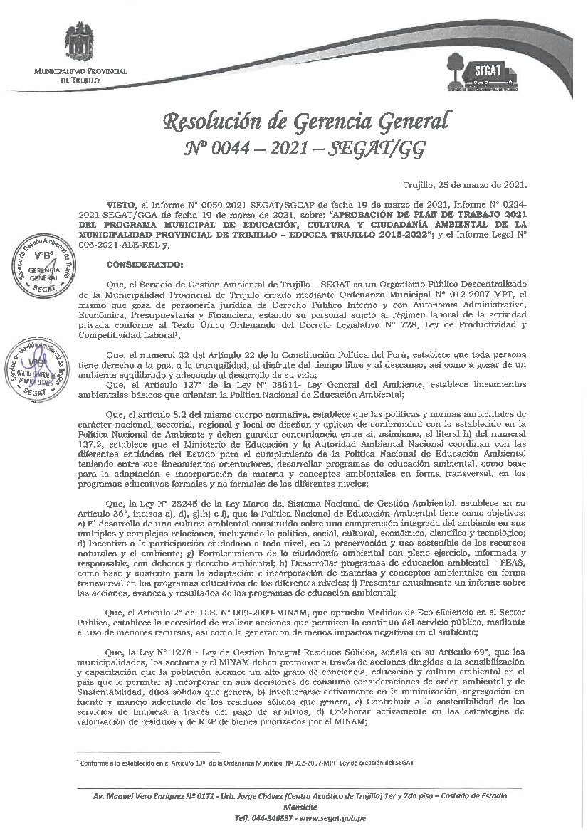 La presente Resolución aprueba el Plan de Trabajo 2021 del Programa Municipal de Educación, Cultura y Ciudadanía Ambiental de la Municipalidad Provincial de Trujillo, con la finalidad de definir las actividades de educación, cultura y ciudadanía ambiental que se desarrollarán en la localidad durante el presente año.