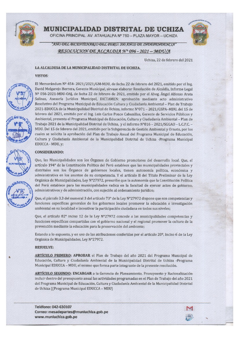 La presente Resolución aprueba el Plan de Trabajo 2021 del Programa Municipal de Educación, Cultura y Ciudadanía Ambiental de la Municipalidad Distrital de Uchiza, con la finalidad de definir las actividades de educación, cultura y ciudadanía ambiental que se desarrollarán en la localidad durante el presente año.