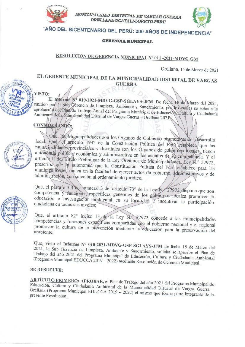 La presente Resolución aprueba el Plan de Trabajo 2021 del Programa Municipal de Educación, Cultura y Ciudadanía Ambiental de la Municipalidad Distrital de Vargas Guerra, con la finalidad de definir las actividades de educación, cultura y ciudadanía ambiental que se desarrollarán en la localidad durante el presente año.