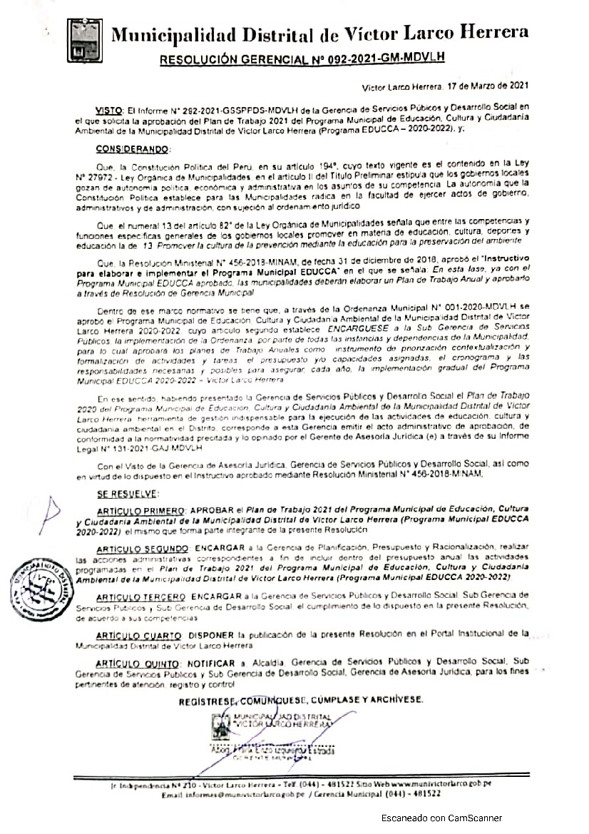La presente Resolución aprueba el Plan de Trabajo 2021 del Programa Municipal de Educación, Cultura y Ciudadanía Ambiental de la Municipalidad Distrital de Víctor Larco Herrera, con la finalidad de definir las actividades de educación, cultura y ciudadanía ambiental que se desarrollarán en la localidad durante el presente año.