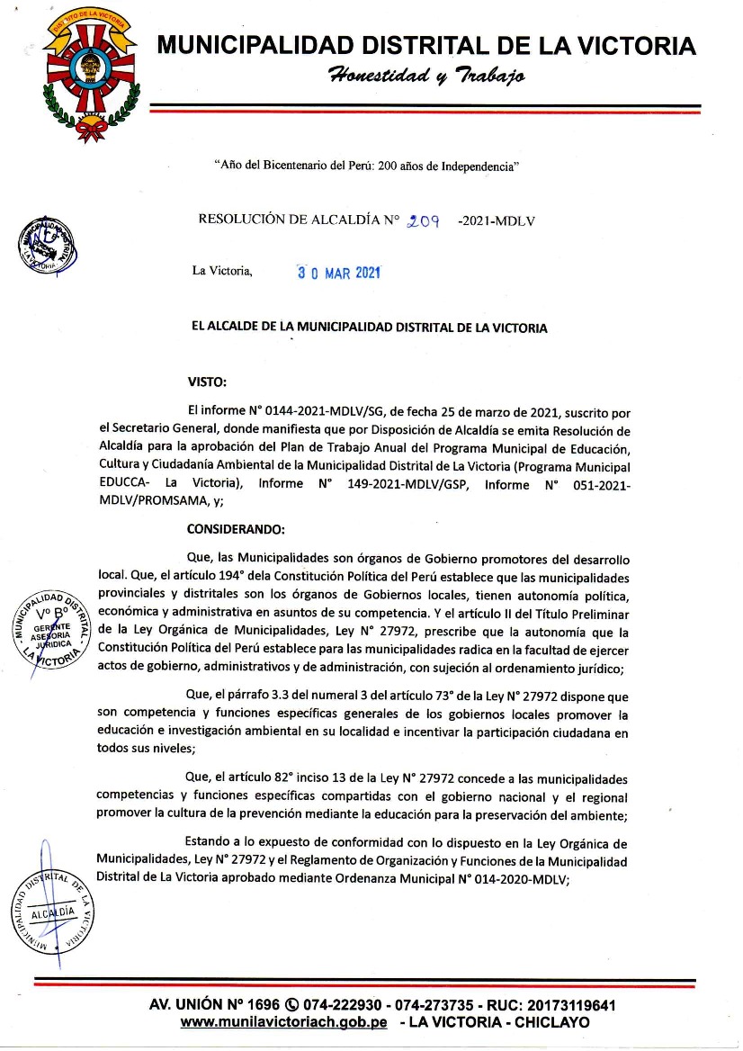 La presente Resolución aprueba el Plan de Trabajo 2021 del Programa Municipal de Educación, Cultura y Ciudadanía Ambiental de la Municipalidad Distrital de La Victoria, con la finalidad de definir las actividades de educación, cultura y ciudadanía ambiental que se desarrollarán en la localidad durante el presente año.