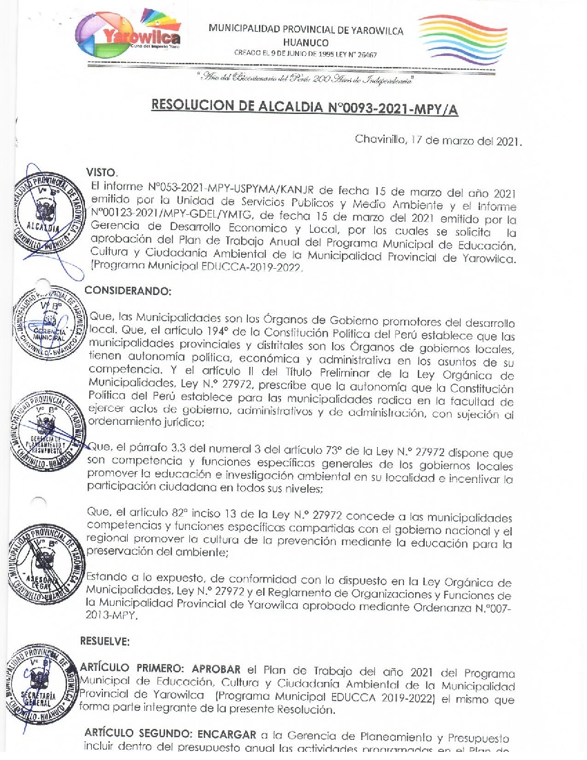 La presente Resolución aprueba el Plan de Trabajo 2021 del Programa Municipal de Educación, Cultura y Ciudadanía Ambiental de la Municipalidad Provincia de Yarowilca, con la finalidad de definir las actividades de educación, cultura y ciudadanía ambiental que se desarrollarán en la localidad durante el presente año.