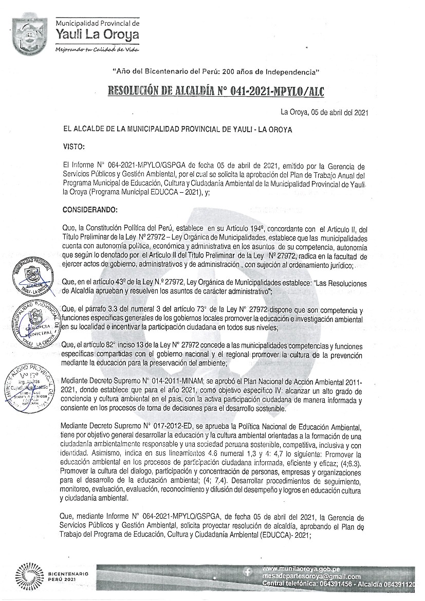 La presente Resolución aprueba el Plan de Trabajo 2021 del Programa Municipal de Educación, Cultura y Ciudadanía Ambiental de la Municipalidad Provincial de Yauli, con la finalidad de definir las actividades de educación, cultura y ciudadanía ambiental que se desarrollarán en la localidad durante el presente año.