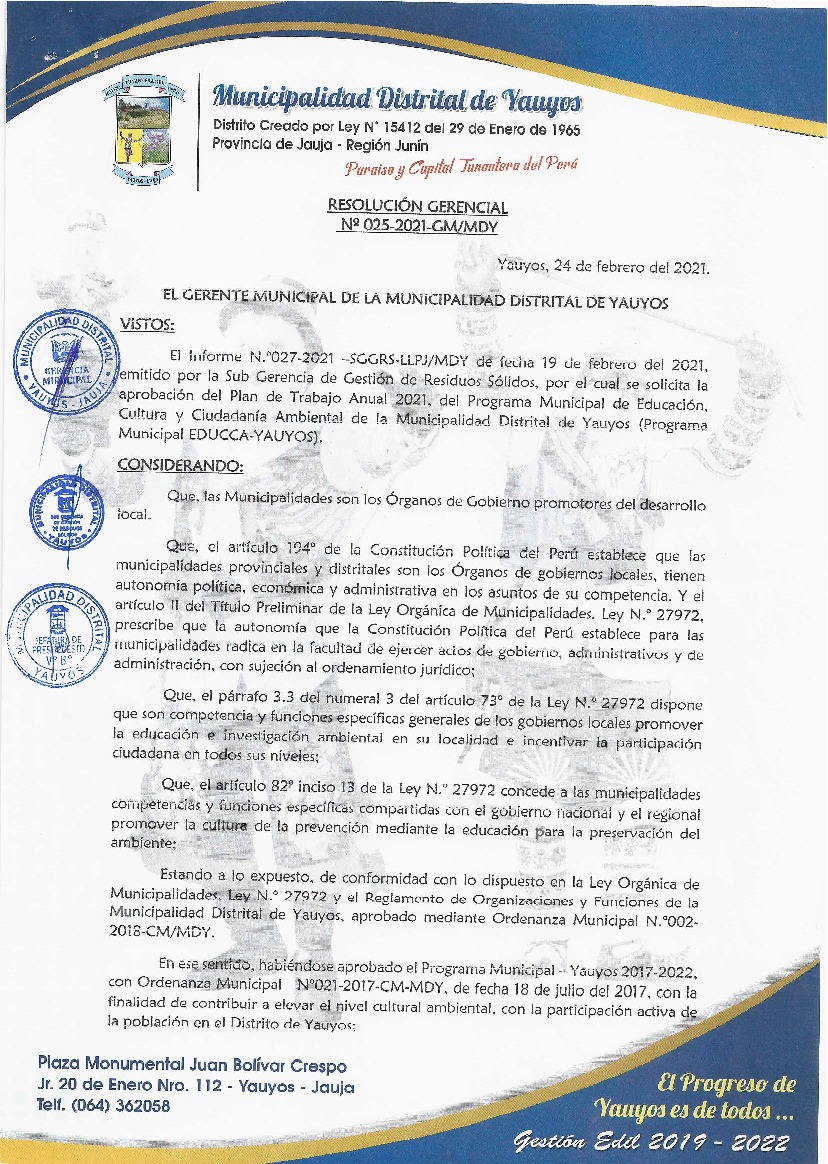 La presente Resolución aprueba el Plan de Trabajo 2021 del Programa Municipal de Educación, Cultura y Ciudadanía Ambiental de la Municipalidad Distrital de Yauyos, con la finalidad de definir las actividades de educación, cultura y ciudadanía ambiental que se desarrollarán en la localidad durante el presente año.