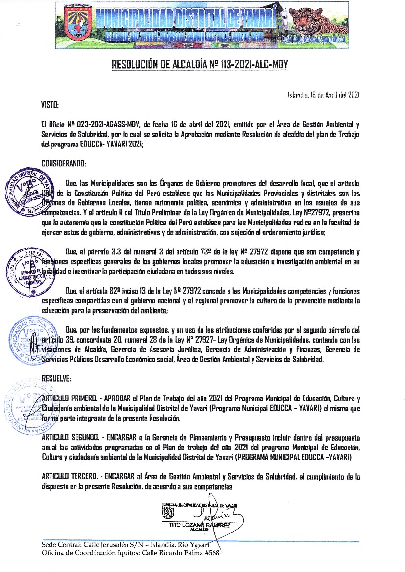 La presente Resolución aprueba el Plan de Trabajo 2021 del Programa Municipal de Educación, Cultura y Ciudadanía Ambiental de la Municipalidad Distrital de Yavari, con la finalidad de definir las actividades de educación, cultura y ciudadanía ambiental que se desarrollarán en la localidad durante el presente año.