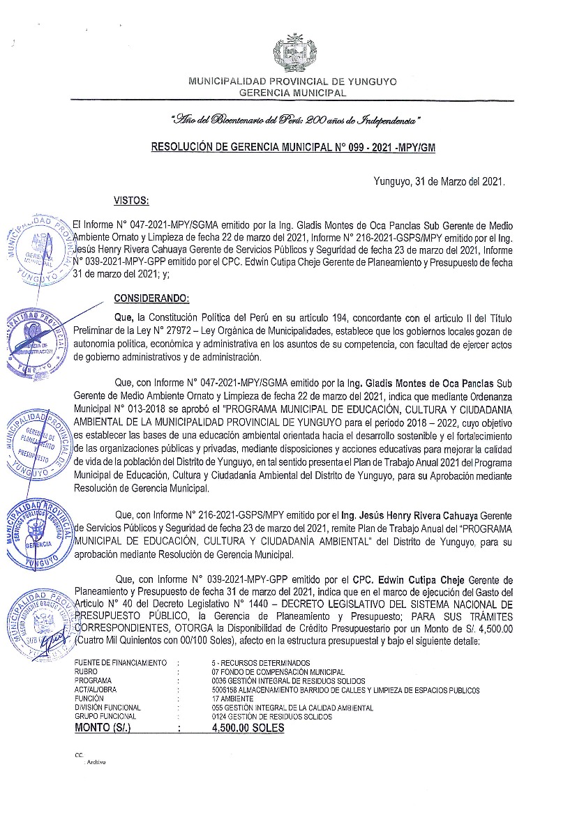 La presente Resolución aprueba el Plan de Trabajo 2021 del Programa Municipal de Educación, Cultura y Ciudadanía Ambiental de la Municipalidad Provincia de Yunguyo, con la finalidad de definir las actividades de educación, cultura y ciudadanía ambiental que se desarrollarán en la localidad durante el presente año.