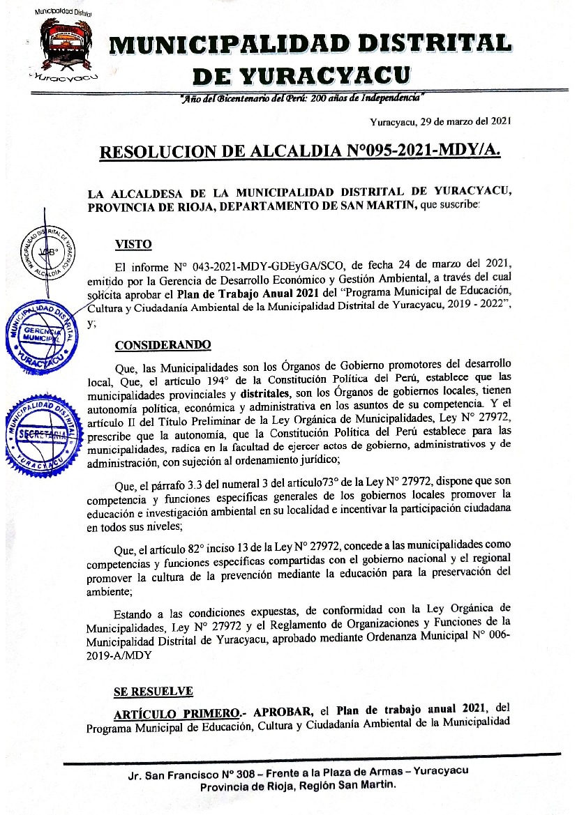 La presente Resolución aprueba el Plan de Trabajo 2021 del Programa Municipal de Educación, Cultura y Ciudadanía Ambiental de la Municipalidad Distrital de Yuracyacu, con la finalidad de definir las actividades de educación, cultura y ciudadanía ambiental que se desarrollarán en la localidad durante el presente año.
