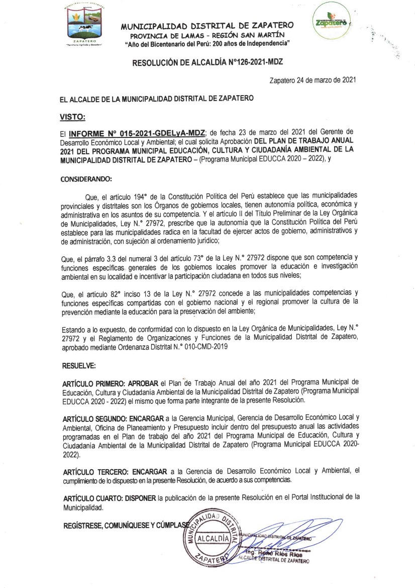 La presente Resolución aprueba el Plan de Trabajo 2021 del Programa Municipal de Educación, Cultura y Ciudadanía Ambiental de la Municipalidad Distrital de Zapatero, con la finalidad de definir las actividades de educación, cultura y ciudadanía ambiental que se desarrollarán en la localidad durante el presente año.