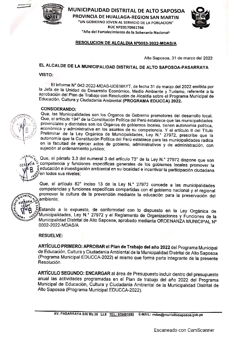 La presente Resolución aprueba el Plan de Trabajo 2022 del Programa Municipal de Educación, Cultura y Ciudadanía Ambiental de la Municipalidad Distrital de Alto Saposoa, con la finalidad de definir las actividades de educación, cultura y ciudadanía ambiental que se desarrollarán en la localidad durante el presente año.