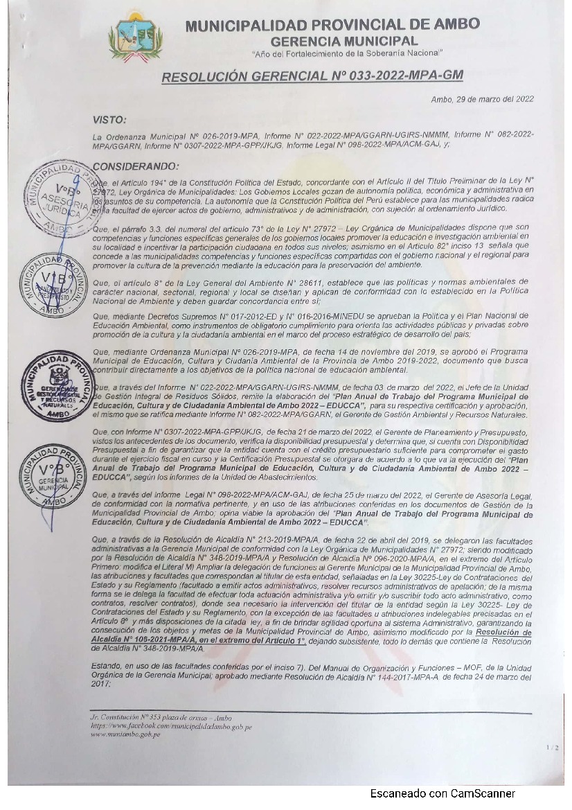 La presente Resolución aprueba el Plan de Trabajo 2022 del Programa Municipal de Educación, Cultura y Ciudadanía Ambiental de la Municipalidad Provincia de Ambo, con la finalidad de definir las actividades de educación, cultura y ciudadanía ambiental que se desarrollarán en la localidad durante el presente año.