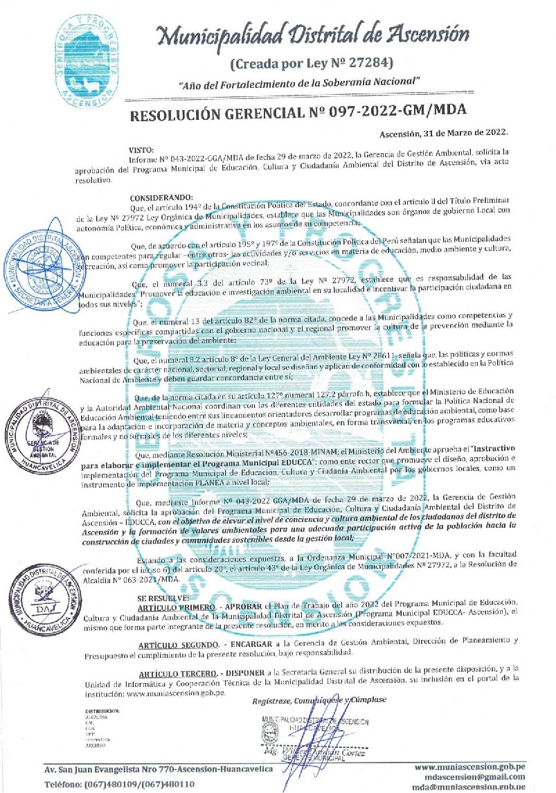 La presente Resolución aprueba el Plan de Trabajo 2022 del Programa Municipal de Educación, Cultura y Ciudadanía Ambiental de la Municipalidad Distrital de Ascensión, con la finalidad de definir las actividades de educación, cultura y ciudadanía ambiental que se desarrollarán en la localidad durante el presente año.