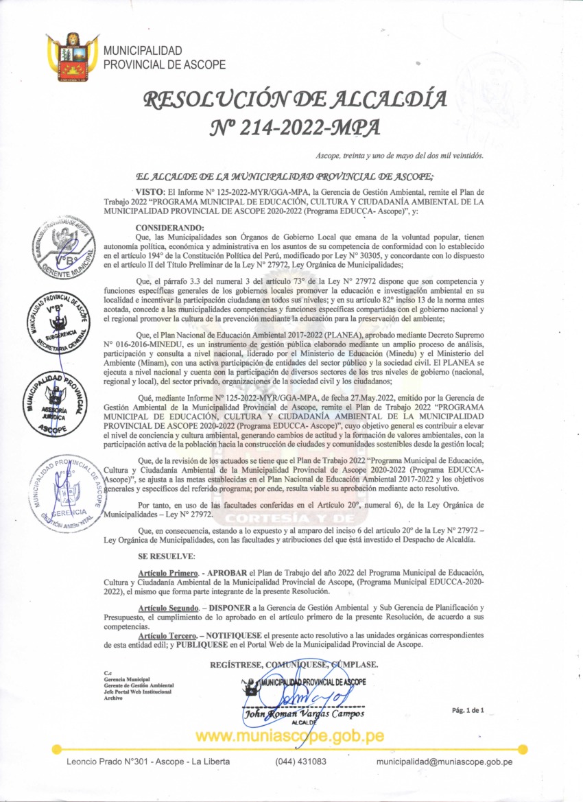 La presente Resolución aprueba el Plan de Trabajo 2022 del Programa Municipal de Educación, Cultura y Ciudadanía Ambiental de la Municipalidad Provincial de Ascope, con la finalidad de definir las actividades de educación, cultura y ciudadanía ambiental que se desarrollarán en la localidad durante el presente año.