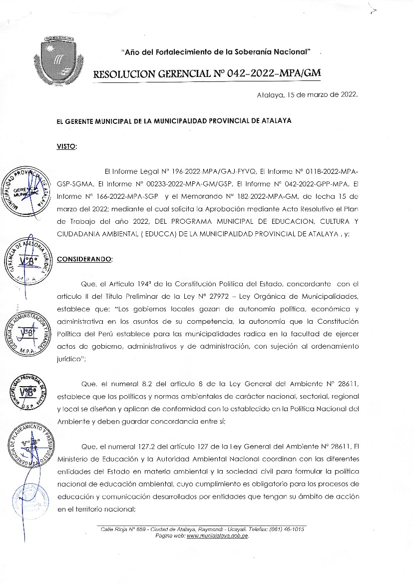La presente Resolución aprueba el Plan de Trabajo 2022 del Programa Municipal de Educación, Cultura y Ciudadanía Ambiental de la Municipalidad Provincia de Atalaya, con la finalidad de definir las actividades de educación, cultura y ciudadanía ambiental que se desarrollarán en la localidad durante el presente año.