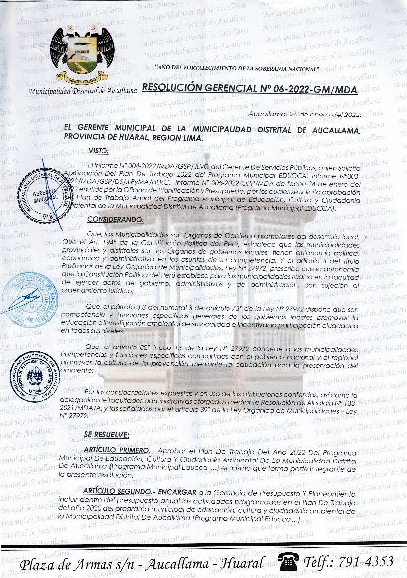La presente Resolución aprueba el Plan de Trabajo 2022 del Programa Municipal de Educación, Cultura y Ciudadanía Ambiental de la Municipalidad Distrital de Aucallama- Huaral, con la finalidad de definir las actividades de educación, cultura y ciudadanía ambiental que se desarrollarán en la localidad durante el presente año.